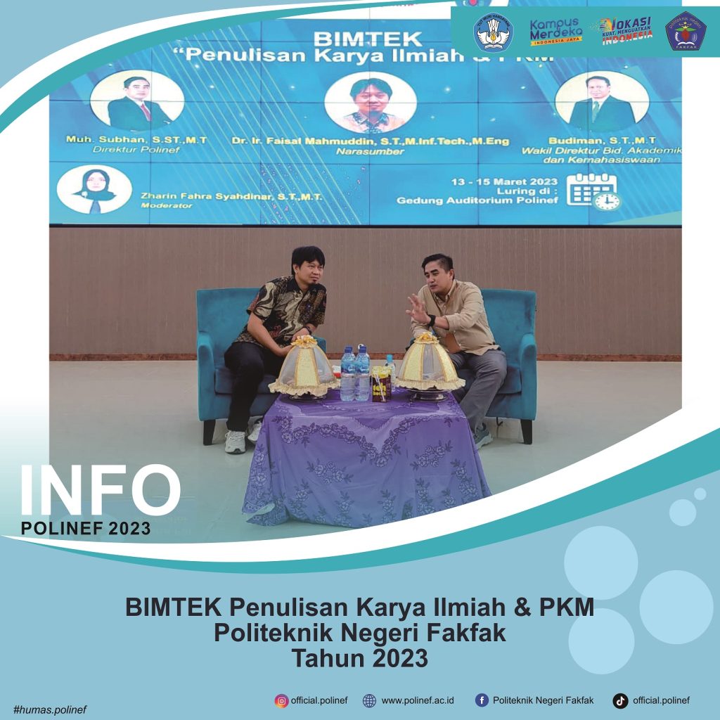 BIMTEK Penulisan Karya Ilmiah & PKM Polinef Tahun 2023 yang diikuti oleh mahasiswa/i perwakilan beberapa jurusan di Polinef, pada kesempatan ini juga Polinef meghadirkan Narasumber Dr. Ir. Faisal Mahmuddin, S.T.,M.Inf.Tech.,M.Eng