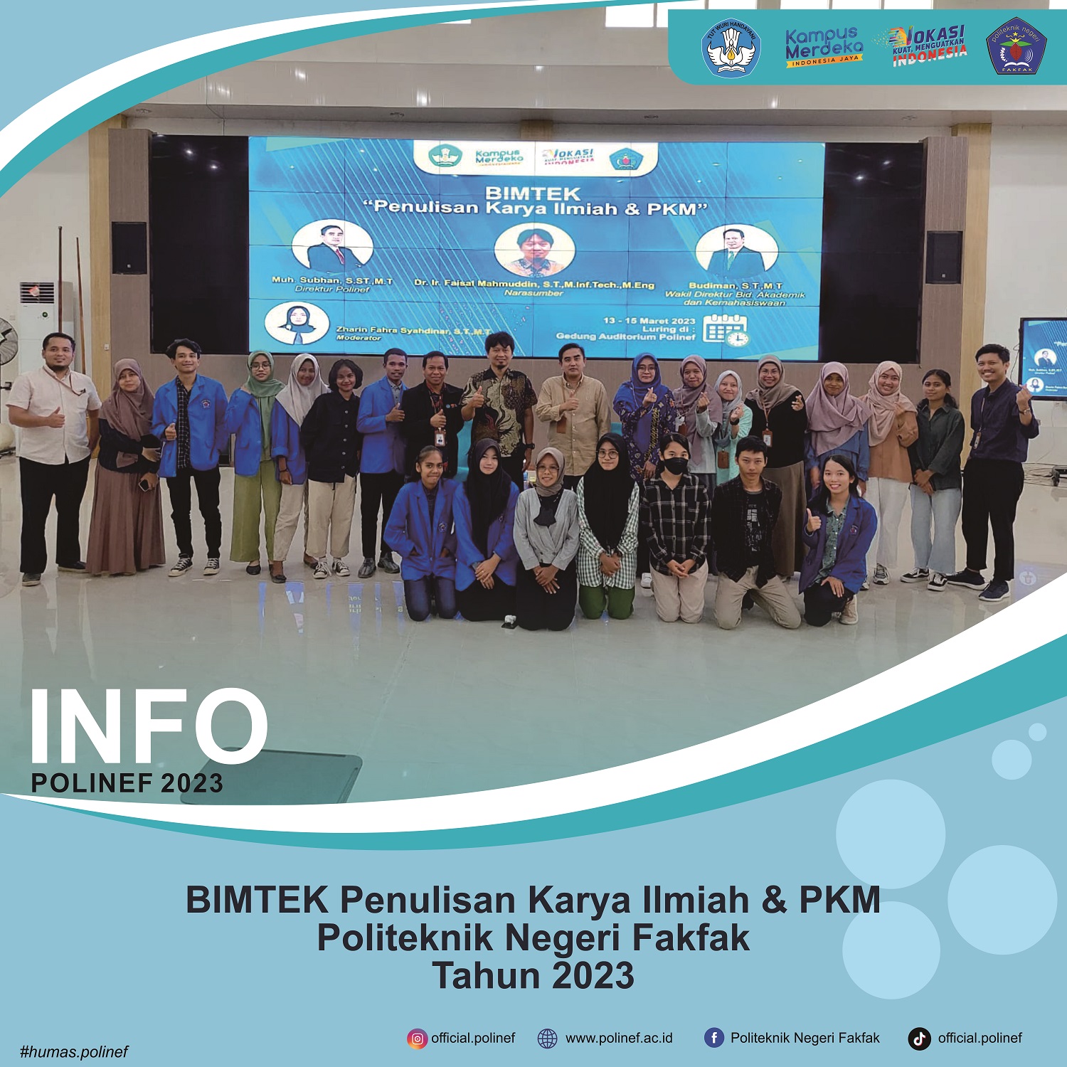 BIMTEK Penulisan Karya Ilmiah & PKM Polinef Tahun 2023 yang diikuti oleh mahasiswa/i perwakilan beberapa jurusan di Polinef, pada kesempatan ini juga Polinef meghadirkan Narasumber Dr. Ir. Faisal Mahmuddin, S.T.,M.Inf.Tech.,M.Eng