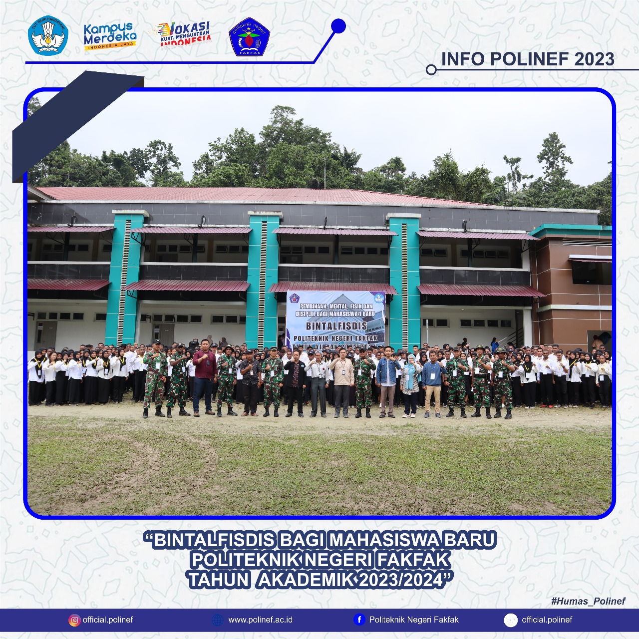 Fakfak, September 2023 – Salah satu kegiatan wajib mahasiswa baru Politeknik Negeri Fakfak Tahun 2023 adalah Pembinaan Mental Fisik dan Disiplin (Bintalfisdis). Kegiatan ini dibuka oleh Bapak Muh. Subhan, S.ST., M.T selaku direktur Politeknik Negeri Fakfak. Tujuan diselenggarakannya kegiatan ini adalah membentuk generasi muda yang handal. Kegiatan ini dilaksanakan selama 3 hari. #polinef #politekniknegerifakfak #centreofexcellence