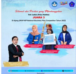 [vc_row][vc_column][vc_column_text]Selamat atas prestasi yang membanggakan mahasiswa Politeknik Negeri Fakfak atas nama : Anita Rahmawati (Agroindustri) 16420011 Jasmin Rahmadhan (Agroindustri) 16420019 Indry Rahayu Ramadanti (Manajemen Informatika) 16320023 sebagai Juara 3 dalam IKAP-KIP National Business Plan Competition Tahun 2022 dengan judul Proposal “Teh Lafak (Pala Fakfak)”. Semoga ke depannya semakin banyak prestasi yang membanggakan. #polinef #politekniknegerifakfak #centreofexcellence[/vc_column_text][/vc_column][/vc_row]