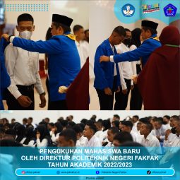 [vc_row][vc_column][vc_column_text]Rabu, 7 September 2022 – Kegiatan Pendidikan Dasar Pembinaan Mental, Fisik, Disiplin, Bela Negara, dan Wawasan Kebangsaan (Diksar Bintal, Fisdis, Belneg, dan Wasbang) bagi mahasiswa baru Politeknik Negeri Fakfak TA 2022/2023 resmi dibuka. Kegiatan ini dibuka dengan dihadiri oleh Dandim 1803/Fakfak, Kepala Dinas Pendidikan dan Olahraga Kab Fakfak, Direktur beserta sivitas akademika Politeknik Negeri Fakfak, […]