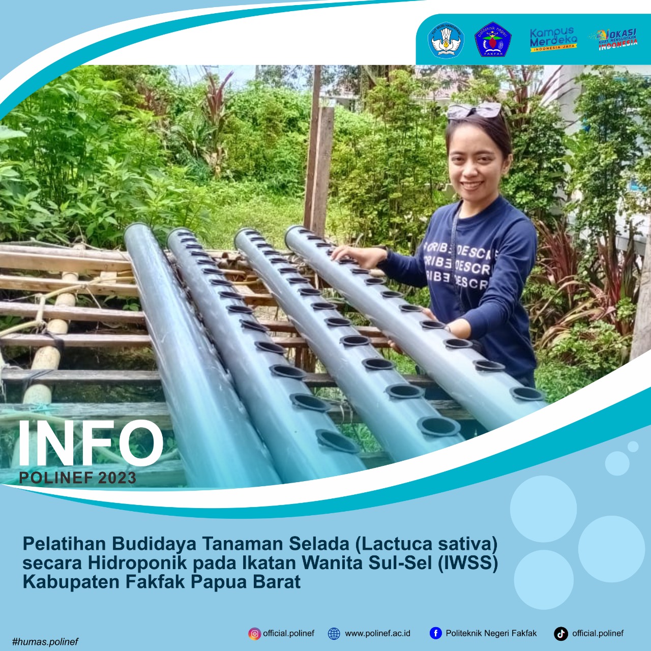 Kegiatan ini diketuai oleh Andi Patimang, S.P., M.Si, pada Agustus 2022 lalu kepada 15 peserta yang berasal dari mitra. Kegiatan ini bertujuan agar masyarakat lebih mengetahui budidaya dengan cara hidroponik. “Kegiatan pengabdian kepada masyarakat yang dilaksanakan oleh tim PKM Polinef bersama dengan para anggota IWSS Fakfak  dapat menambah ilmu pengetahuan dan keterampilan dalam hal budidaya tanaman selada secara Hidroponik dengan sistem DFT”, ujarnya.