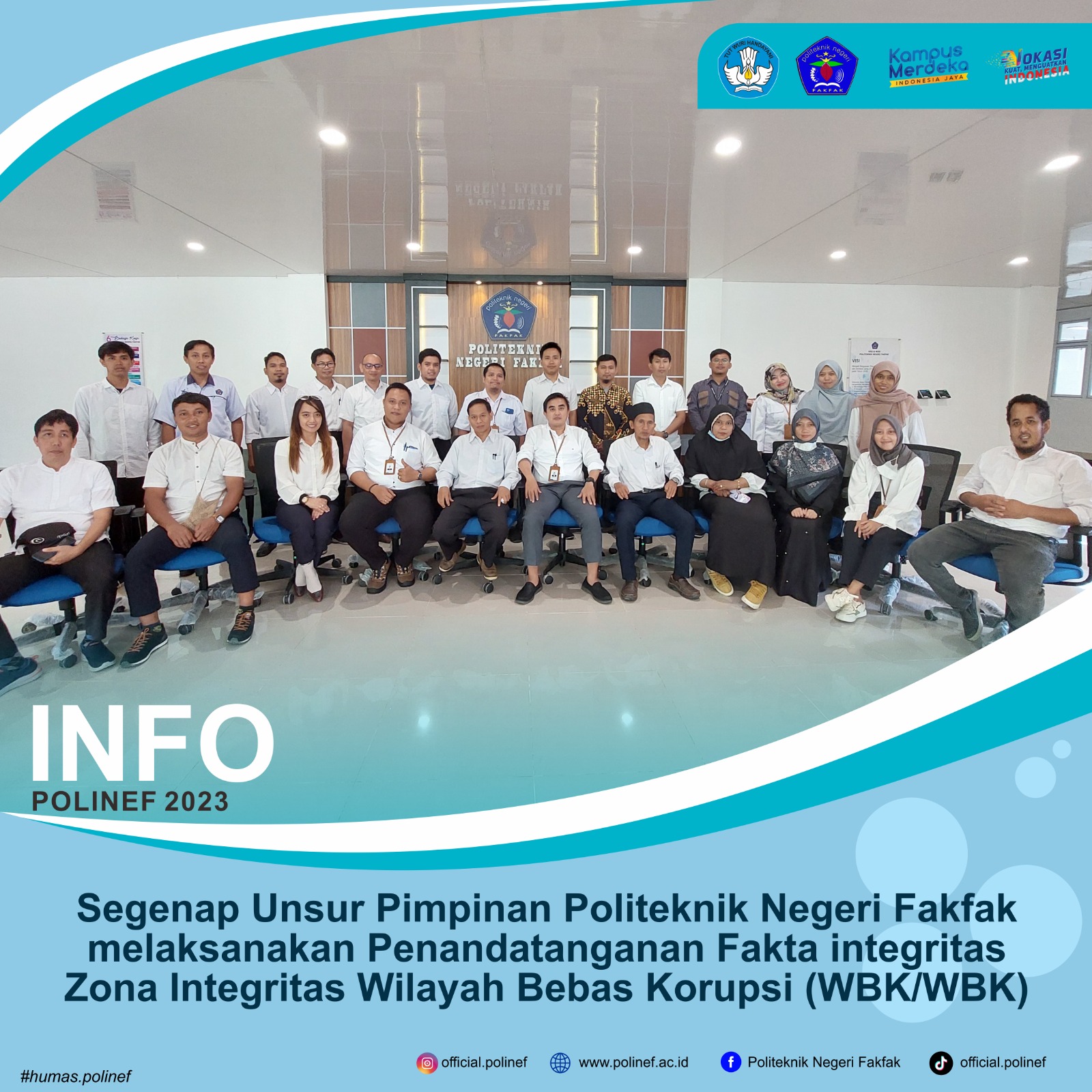 Fakfak, 7 Februari 2023 – Segenap pejabat struktural Politeknik Negeri Fakfak melakukan penandatanganan pakta integritas zona integritas Wilayah Bebas dari Korupsi (WBK) dan Wilayah Birokrasi Bersih dan Melayani (WBBM). Kegiatan ini menunjukkan komitmen seluruh jajaran pejabat struktural Politeknik Negeri Fakfak dalam melaksanakan reformasi birokrasi melalui penataan terhadap sistem penyelenggaraan pemerintahan yang bersih, baik, efektif, dan efisien, sehingga dapat melayani masyarakat secara cepat, tepat, dan professional.