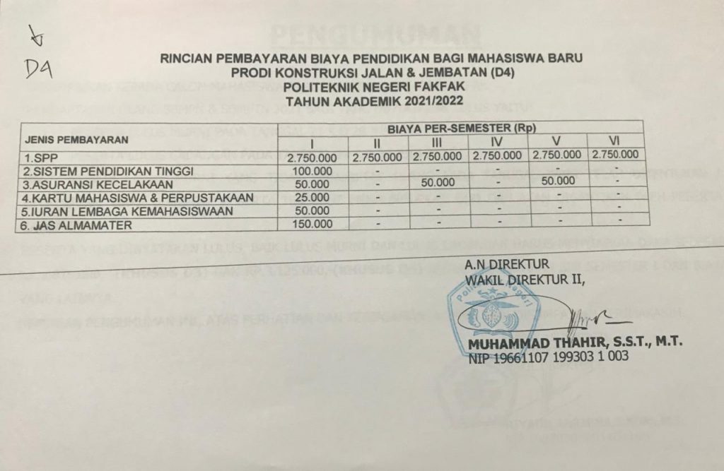 PESERTA YANG DINYATAKAN LULUS, BAIK LULUS MURNI DAN LULUS CADANGAN HARUS MENYIAPKAN DANA SEBESAR RP.1.875.000,- (KHUSUS D3) DAN RP.3.125.000,-(KHUSUS D4) UNTUK PEMBAYARAN SPP SEMESTER I DAN BIAYA YANG LAINNYA.