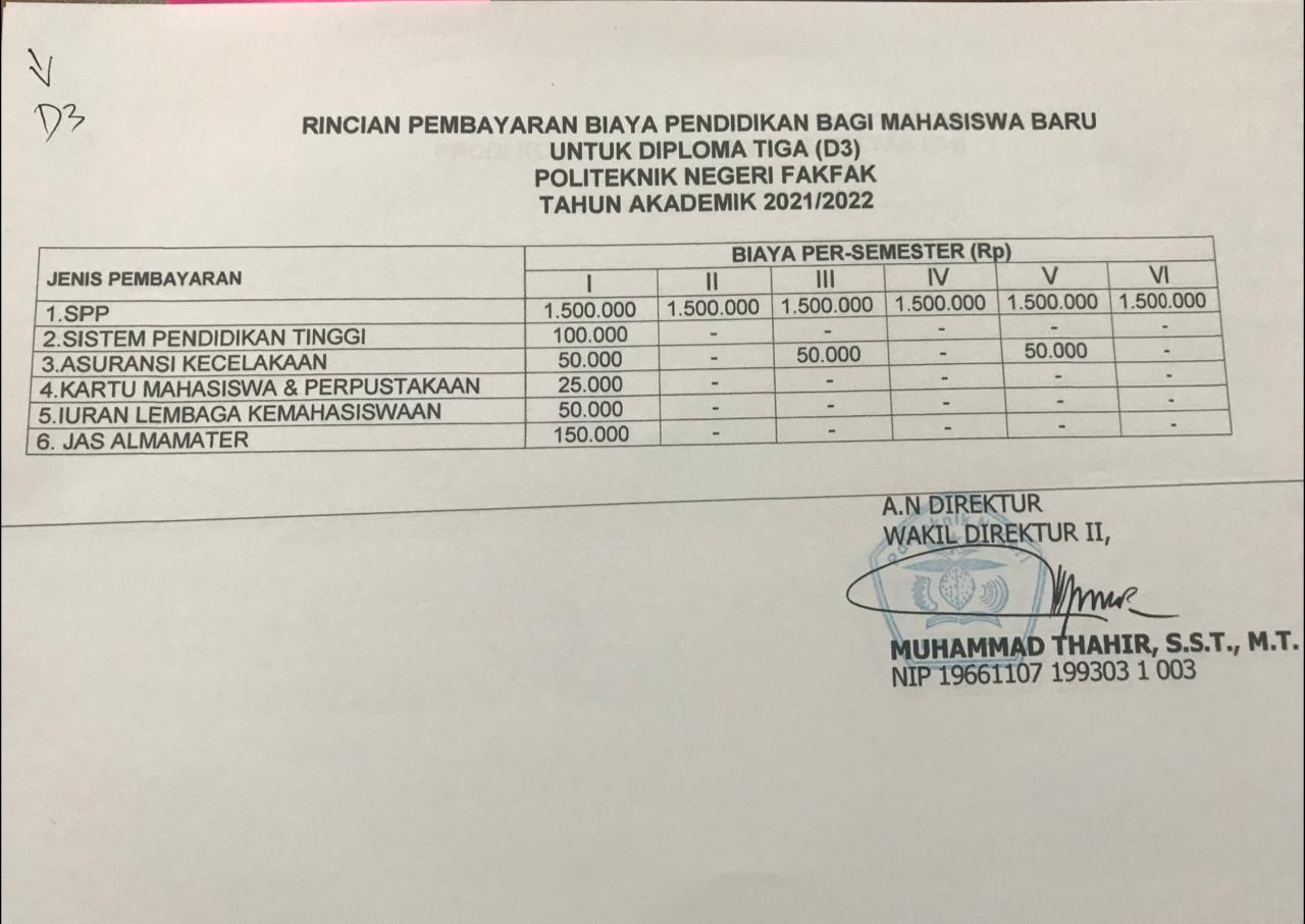 PESERTA YANG DINYATAKAN LULUS, BAIK LULUS MURNI DAN LULUS CADANGAN HARUS MENYIAPKAN DANA SEBESAR RP.1.875.000,- (KHUSUS D3) DAN RP.3.125.000,-(KHUSUS D4) UNTUK PEMBAYARAN SPP SEMESTER I DAN BIAYA YANG LAINNYA.
