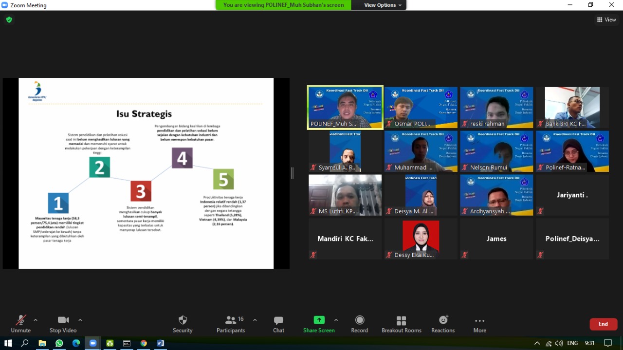 Polinef turut ambil bagian melakukan sharing session dalam rangka membuka program Fast Track SMK to D2 yang merupakan program yang dijagokan Ditjen Dikti Vokasi Kementerian Pendidikan, Kebudayaan, Riset, dan Teknologi. Sharing session ini dilakukan dalam dua sesi. Sesi pertama dilaksanakan pada 19 Juli 2021 bersama dengan Dunia Kerja, Dunia Industri dan Dunia Kerja di kabupaten Fakfak, yang dihadiri antara lain oleh Perwakilan BP Tangguh, KPPN Fakfak, BRI Kanca Fakfak, Bank Mandiri Kanca Fakfak, Tukang Bangunan, serta turut dihadiri oleh perwakilan Huawei Indonesia langsung dari Jakarta. Dalam kesempatan ini dilakukan diskusi mengenai kebutuhan kualifikasi Sumber Daya Manusia di masing-masing institusi/perusahaan, dilanjutkan dengan pembicaraan tentang possibility yang ada di kabupaten Fakfak untuk program Fast Track ini. Di sesi ke dua yang dilaksanakan pada tanggal 21 Juli 2021, sharing session dilaksanakan bersama perwakilan SMK se kabupaten Fakfak, yaitu SMK Negeri I Werba, SMK Yapis, dan SMK Negeri 2 Bomberay. Dalam sesi ini, Polinef dan pihak SMK mendiskusikan mengenai kondisi masing-masing SMK serta kesediaan untuk ambil bagian dalam program Fast Track ini. Hasil diskusi kemudian akan dilanjutkan dengan FGD di waktu yang akan datang.