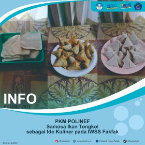 Salah satu inovasi dari dosen Polinef adalah samosa dengan isian ikan tongkol. Perpaduan ini dibuat dengan melihat potensi Kabupaten Fakfak yang banyak ikan. Kegiatan PKM yang dilaksanakan oleh Tim PKM Polinef bersama dengan anggota IWSS Fakfak dapat menambah ilmu pengetahuan dan keterampilan dalam hal pengolahan, pengemasan dan pemasaran Samosa Ikan Tongkol.