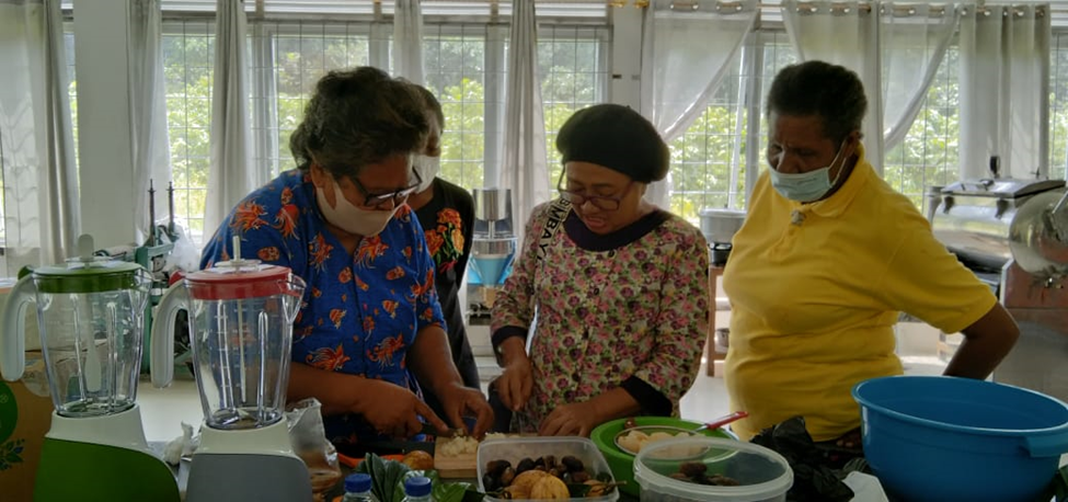 Kegiatan ini diawali dengan praktik bersama membuat minuman instan herbal dari jahe, kunyit. sereh, dau pandan dan daging pala. Para peserta pelatihan sangat antusias sekali dengan kegiatan ini. Ibu Delima, salah satu peserta pelatihan mengungkapkan bahwa, “Kami sangat senang dengan adanya kegiatan seperti ini. Kami harap ada kegiatan semacam ini untuk produk berbasis pala lainnya yang bisa dilakukan”.