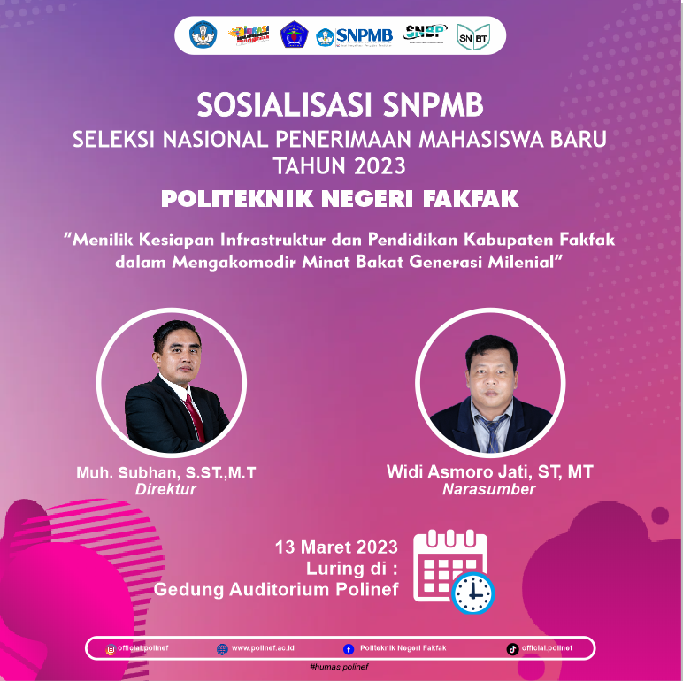 Ada acara keren nih bagi Bapak/Ibu kepala sekolah dan guru, siswa/siswi SMA sederajat, dan mahasiswa. Kegiatan ini adalah *Sosialisasi SNPMB* dengan tema *Menilik Kesiapan Infrastruktur dan Pendidikan Kabupaten Fakfak dalam Mengakomodir Minat Bakat Generasi Milenial* dengan narasumber hebat yaitu Bapak Widi Asmoro Jati, S.T., M.T.