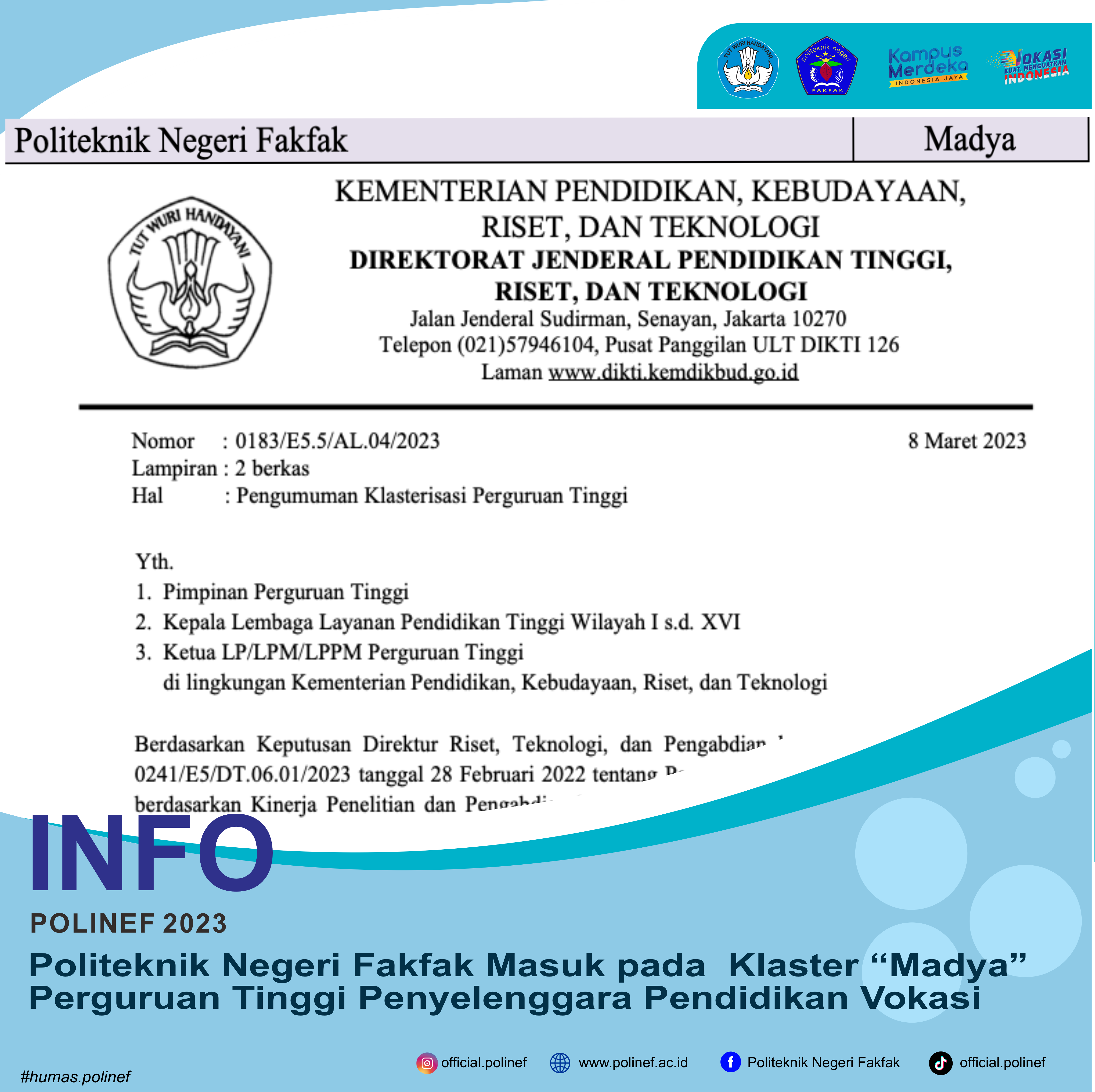 [vc_row][vc_column][vc_column_text]Selamat, Politeknik Negeri Fakfak masuk dalam klaster “Madya” Perguruan Tinggi Penyelenggaraan Pendidikan Vokasi Berdasarkan Keputusan Direktur Riset, Teknologi, dan Pengabdian kepada Masyarakat NomorĀ 0241/E5/DT.06.01/2023 tanggal 28 Februari 2022 tentang Penetapan Klasterisasi Perguruan Tinggi